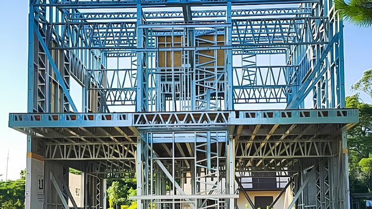 O Steel Frame é um sistema construtivo moderno que utiliza perfis de aço galvanizado (estrutura leve de aço) como esqueleto principal da casa ou edifício. As paredes, lajes e telhado são montados sobre essa estrutura metálica, formando um sistema seco, rápido e extremamente preciso. É como uma “montagem de Lego” de alta engenharia, mas em escala real.